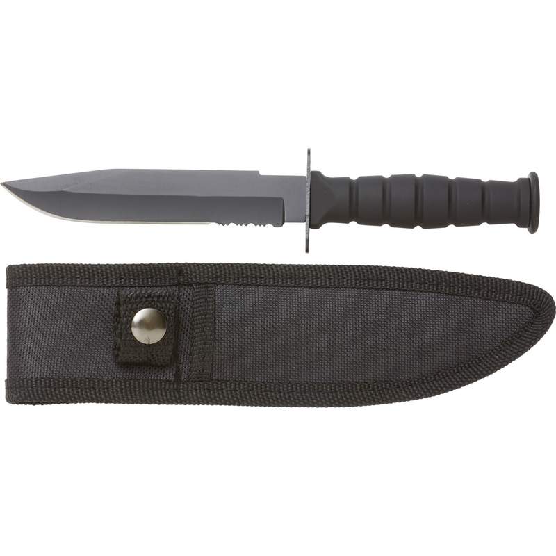 Features non-glare black partially-serrated blade, rubber overmold handle and nylon sheath. Measures 7-1/2" overall, with a 4" blade. Limited lifetime warranty. Gift boxed.