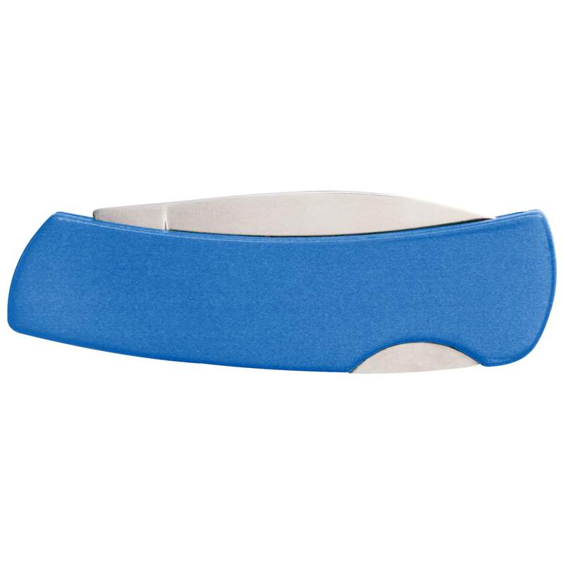 Features stainless steel handle with custom blue finish for laser engraving. Measures 3-1/2" closed, 5-7/8" open. Limited lifetime warranty. Gift boxed.