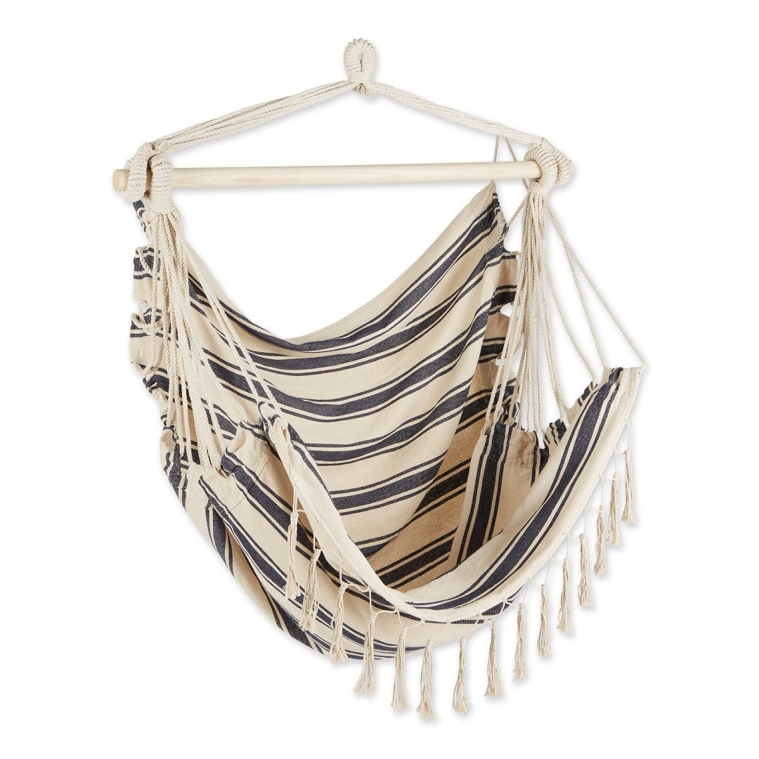 Blue And Cream Ticking Stripe Hammock Chair With Fringe Trim