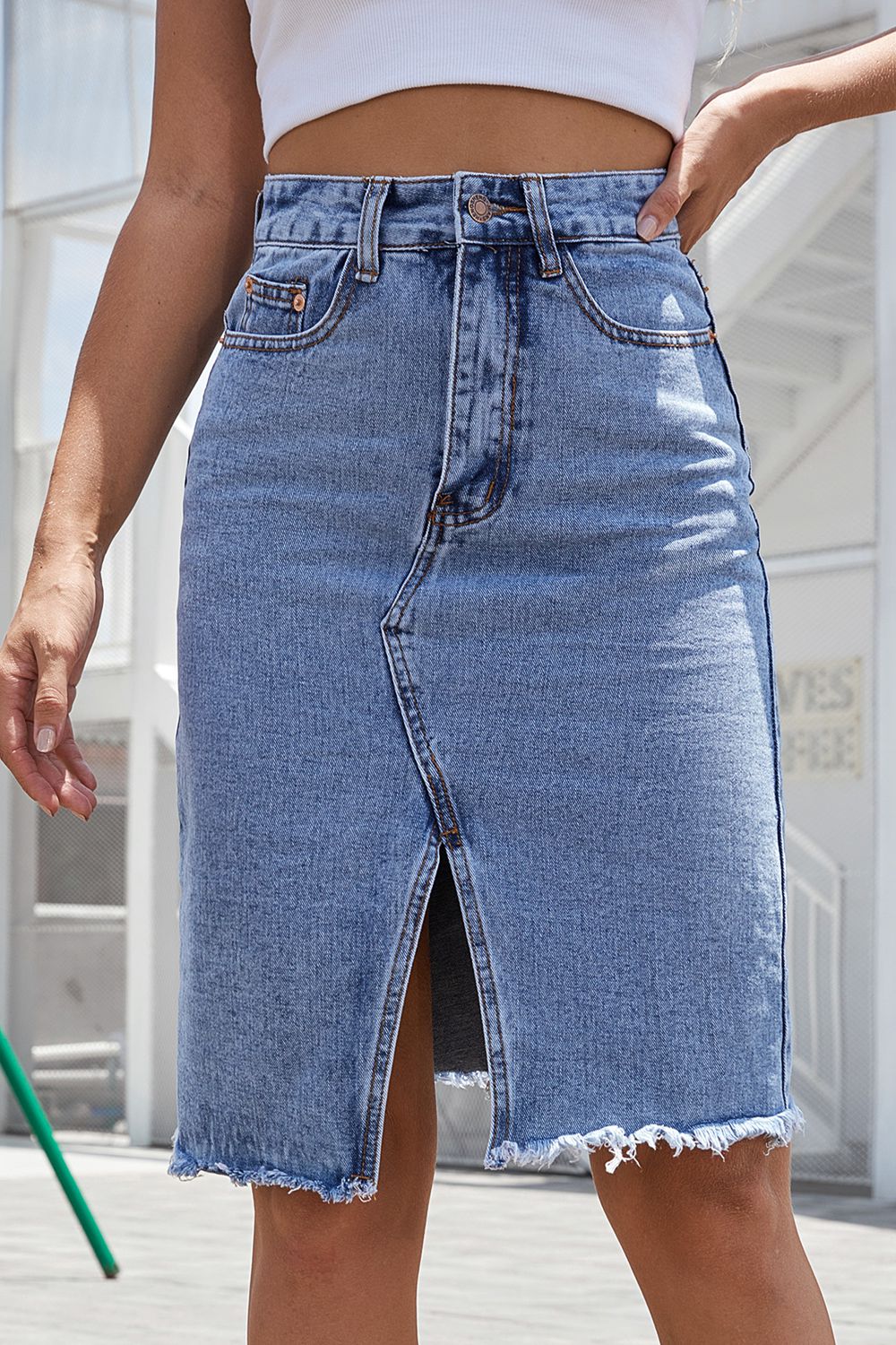 Buttoned Slit Denim Skirt