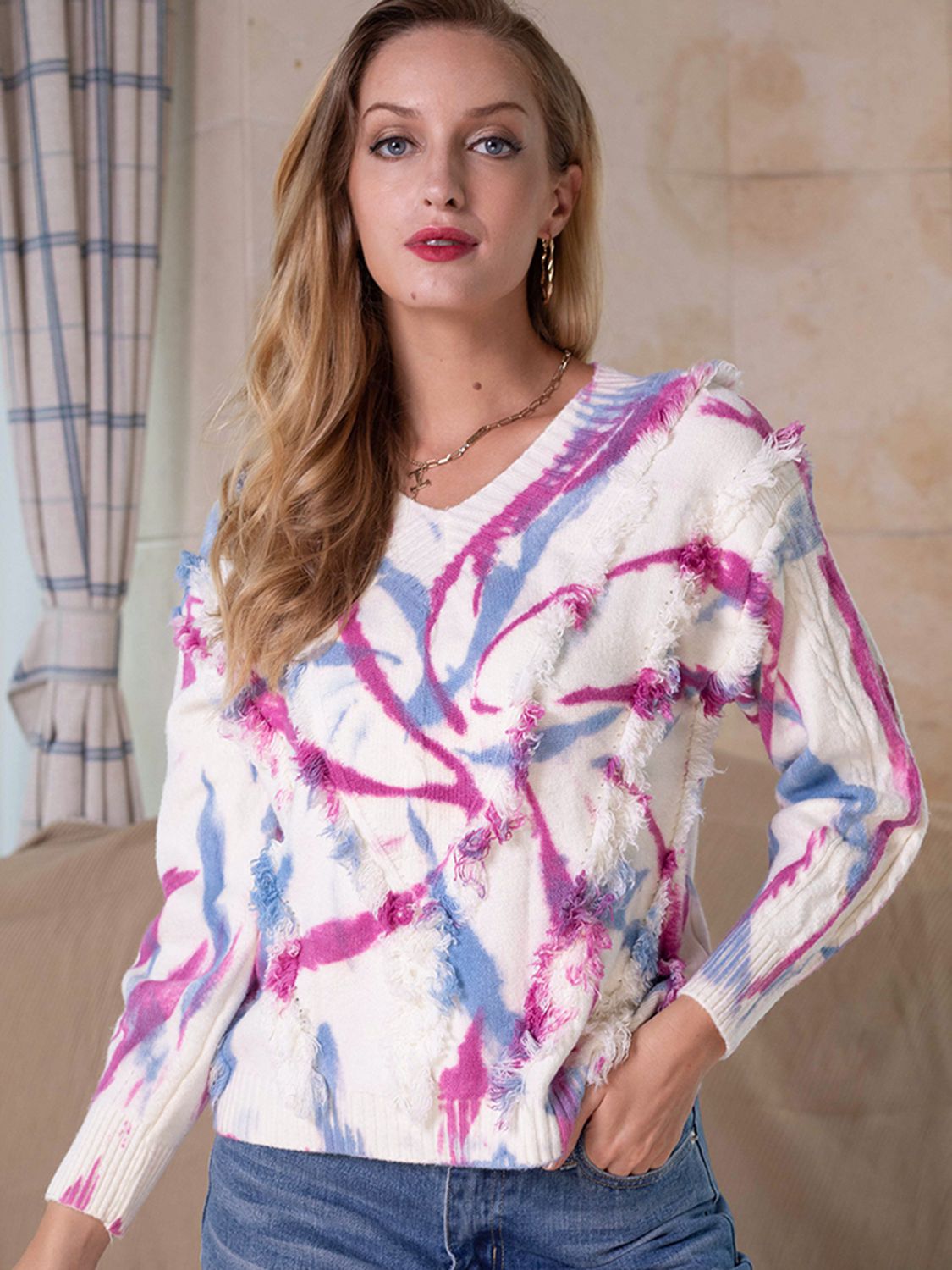 Contrast Fringe Trim V-Neck Sweater