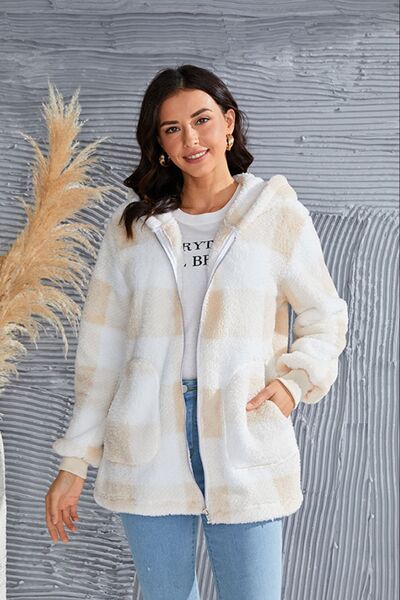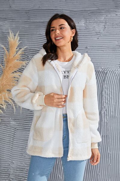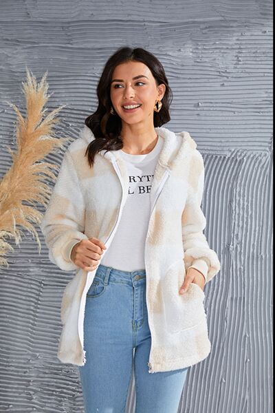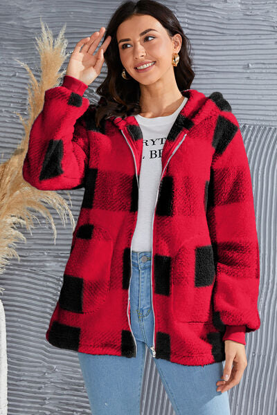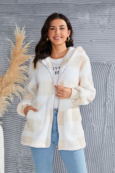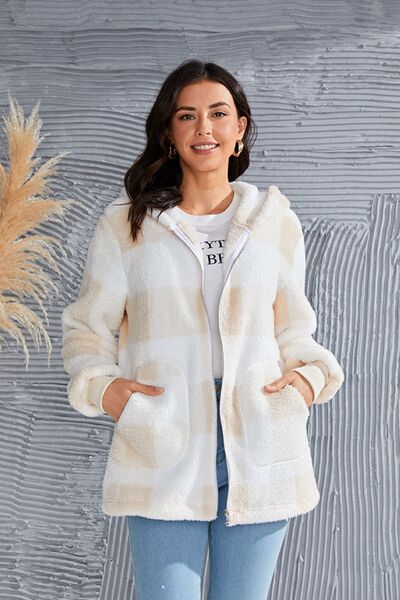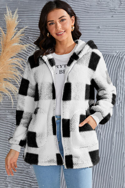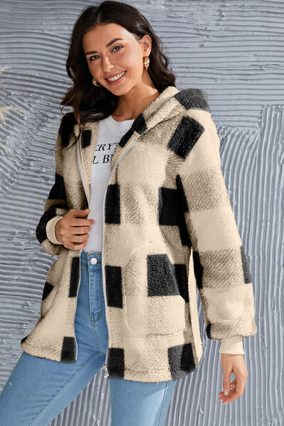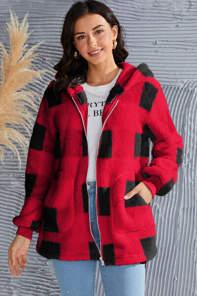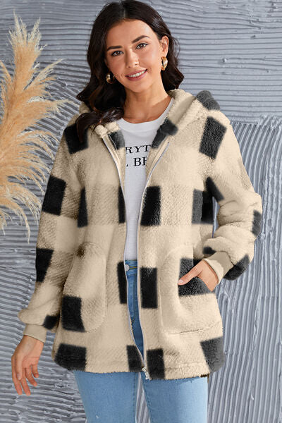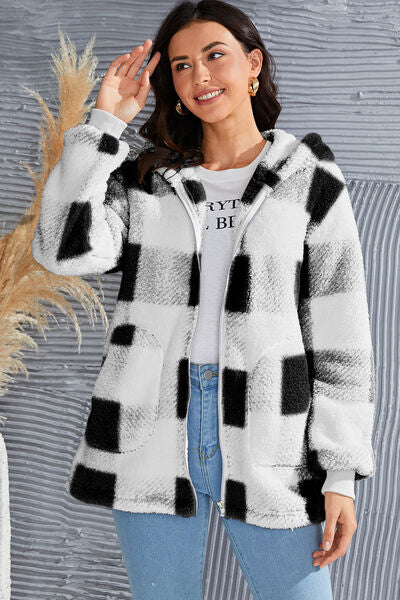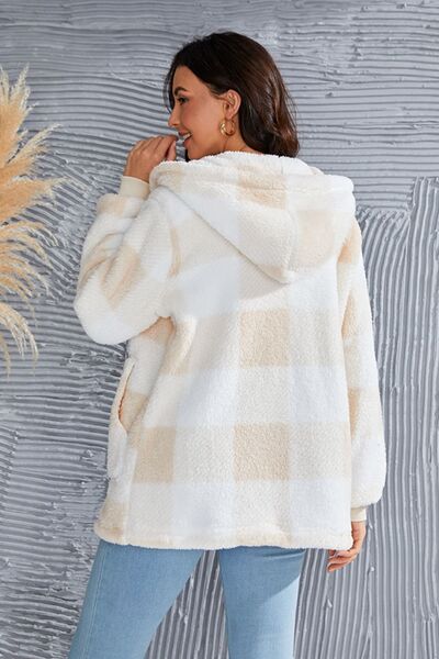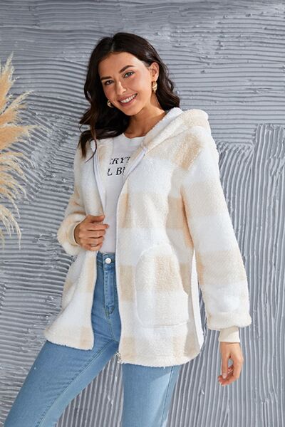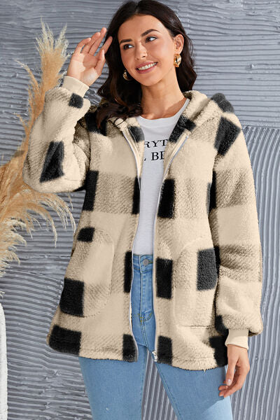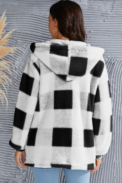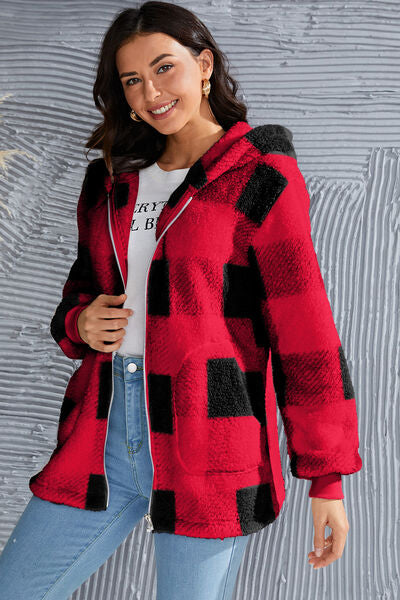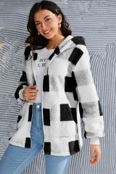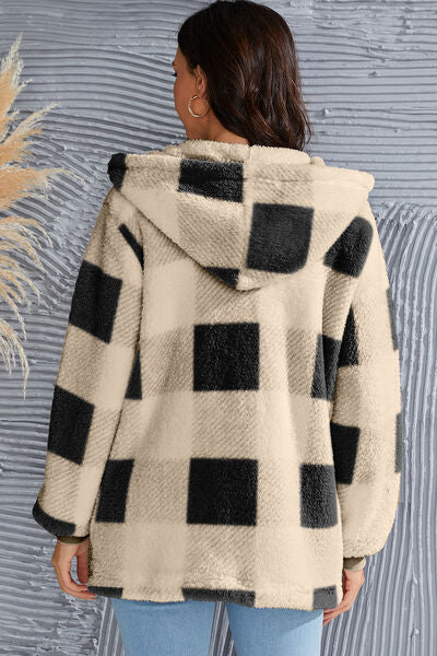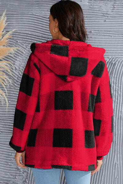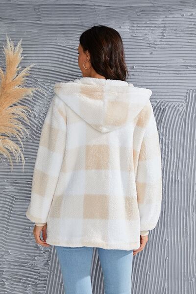 Double Take Full Size Plaid Long Sleeve Hooded Coat