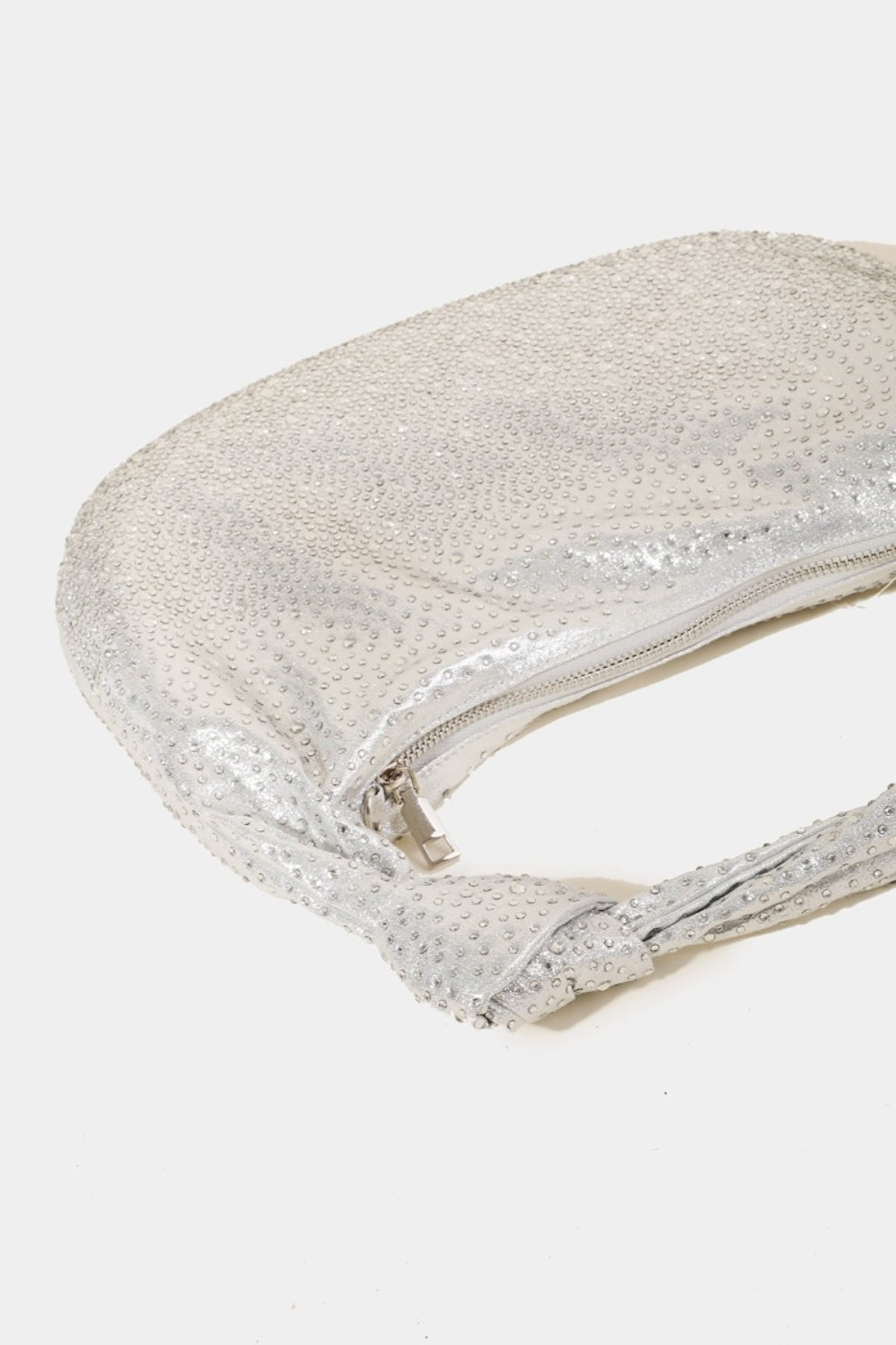 This bag introduces a unique rhinestone studded hobo style. Immerse yourself in the world of understated glamour as this accessory effortlessly exudes timeless appeal.