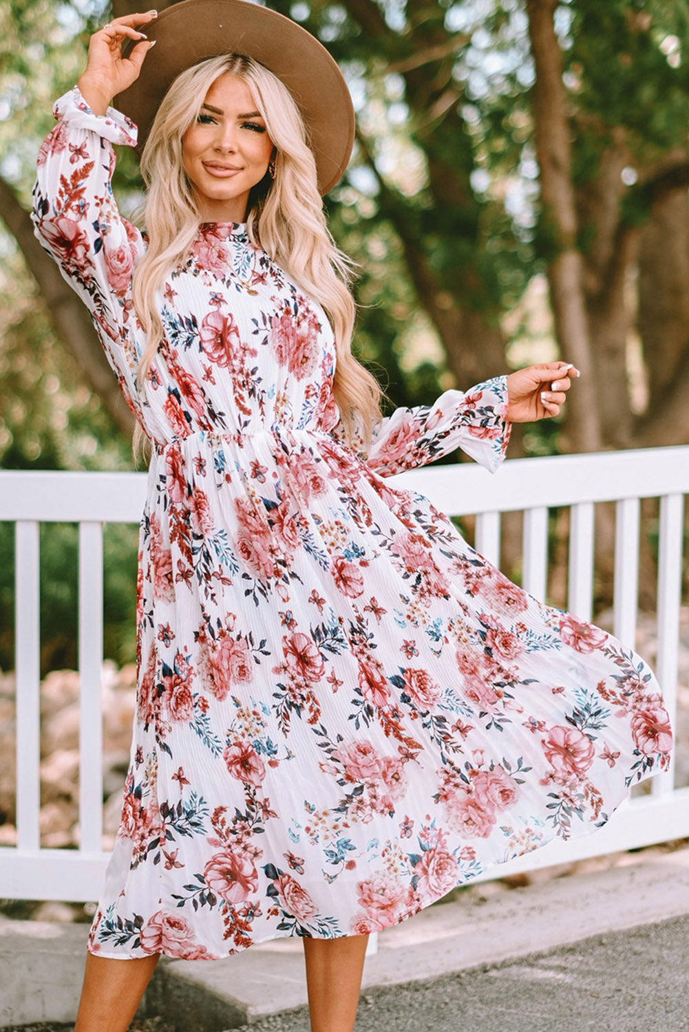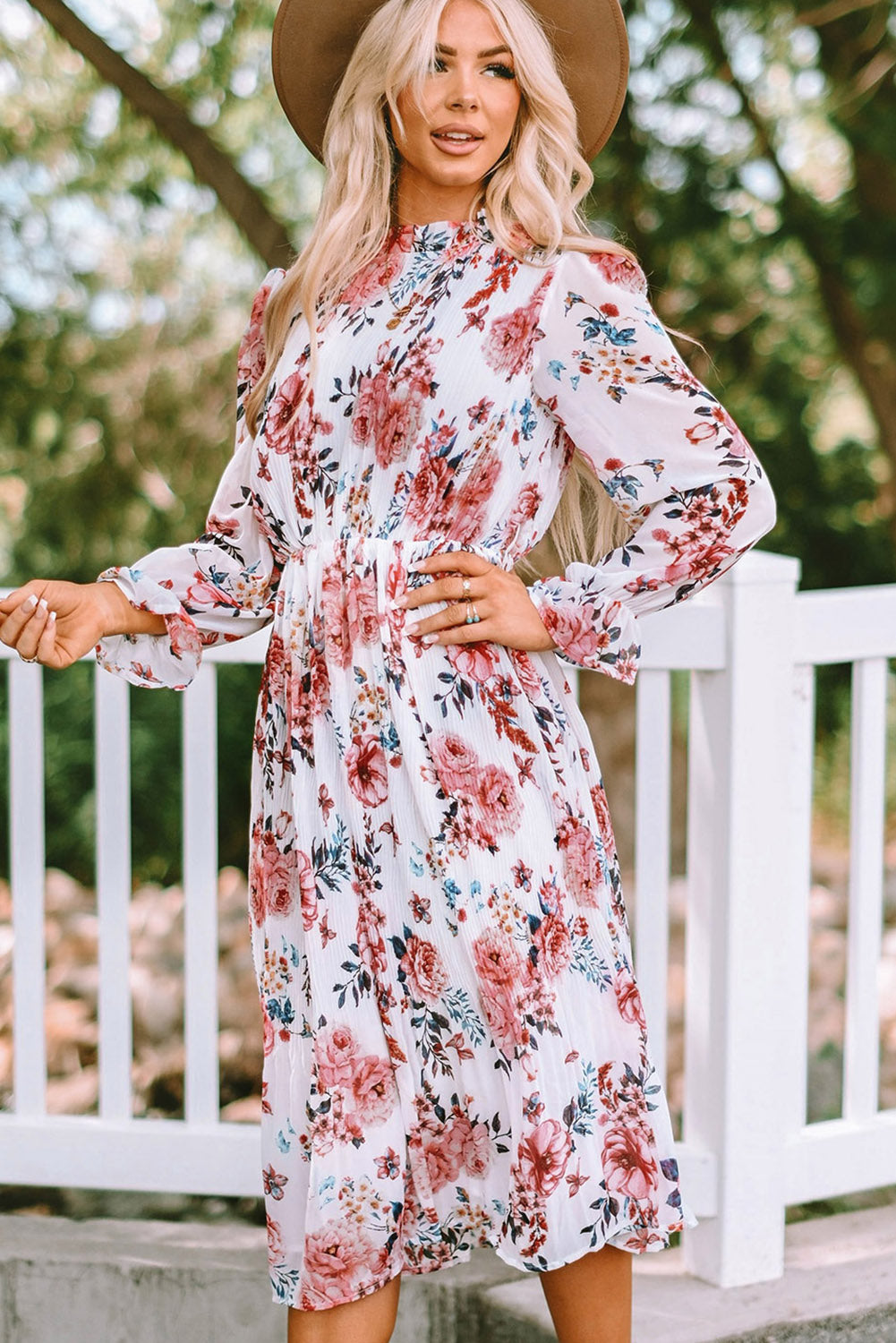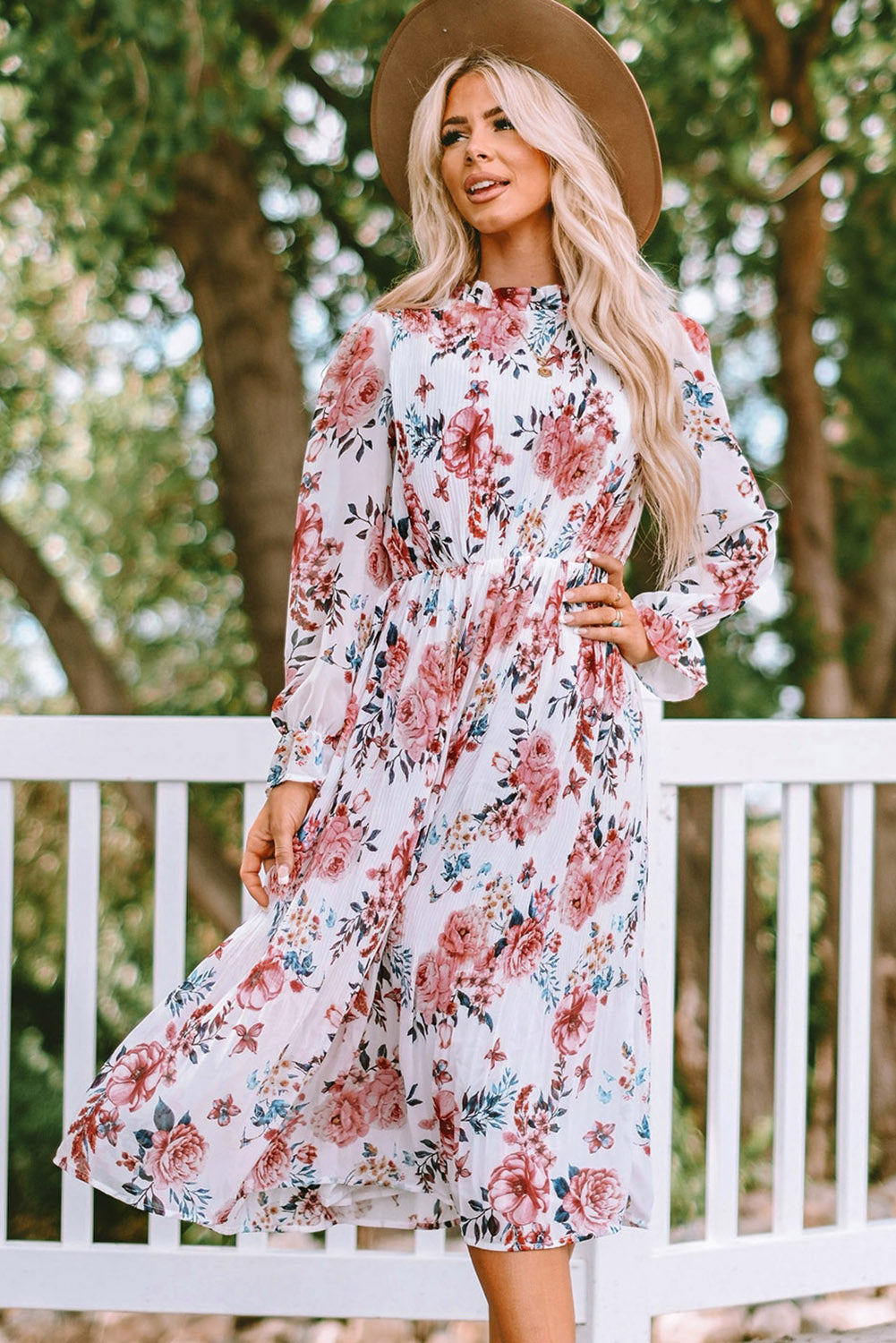 Floral Mock Neck Flounce Sleeve Midi Dress