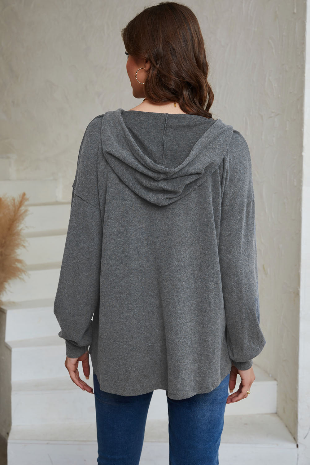 Full Size Buttoned Drop Shoulder High-Low Hoodie