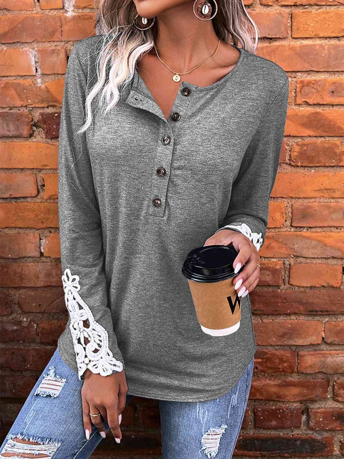 Half Button Lace Detail T-Shirt