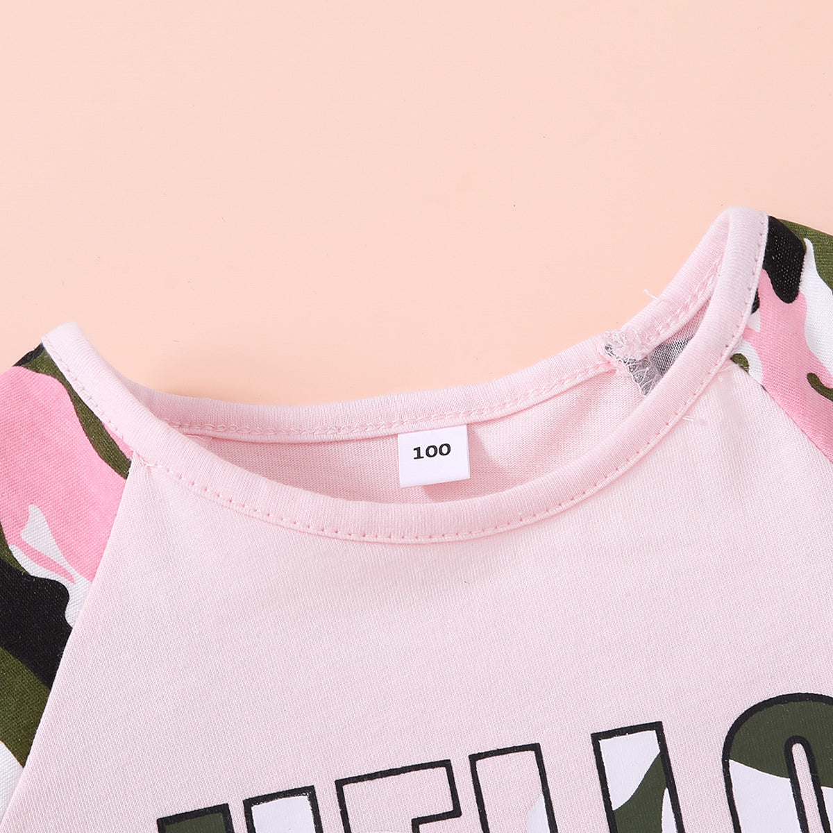 HELLO GIRL Graphic Tee and Camouflage Shorts Set