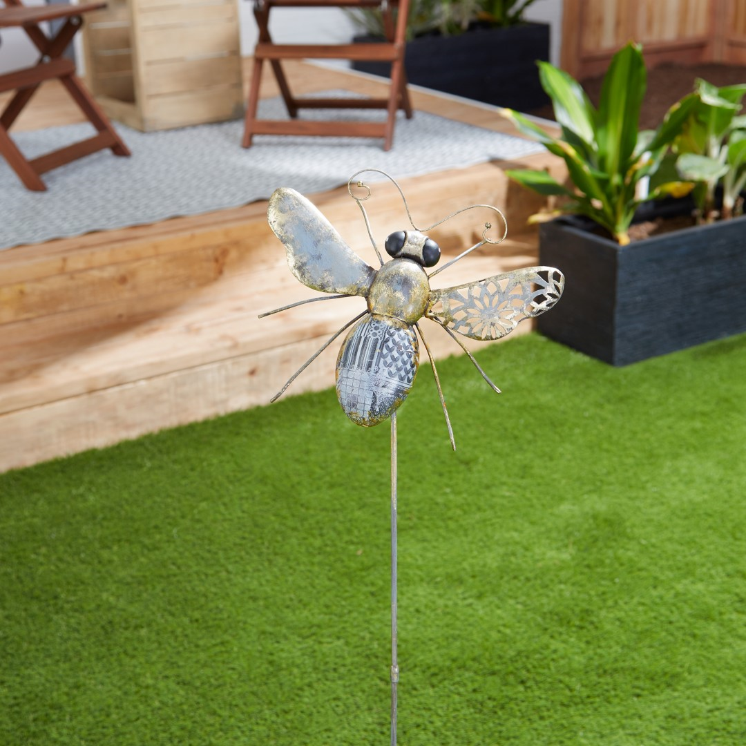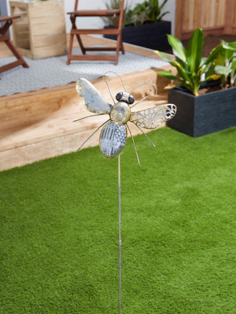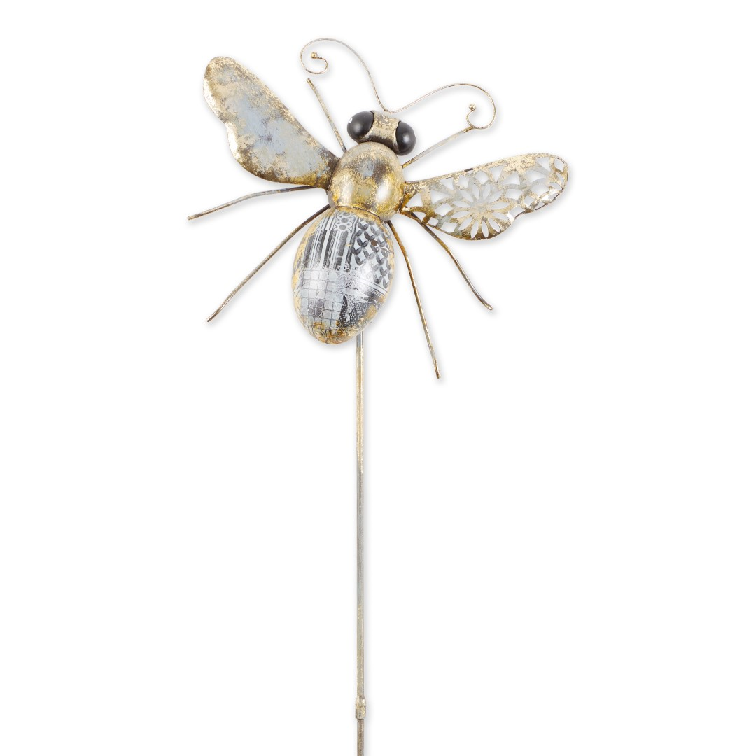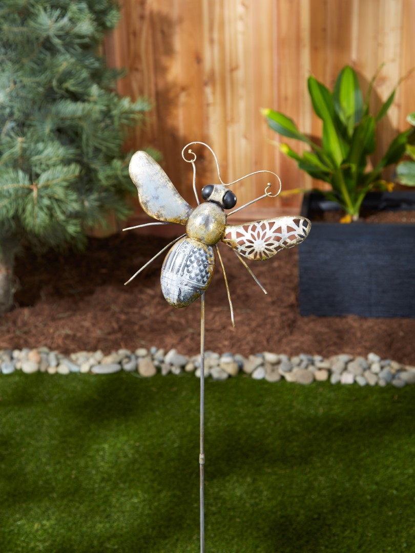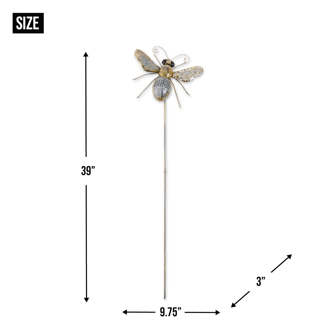 - Charming small bee garden stake is made of iron and measures 10.75x2.75x37 inches.