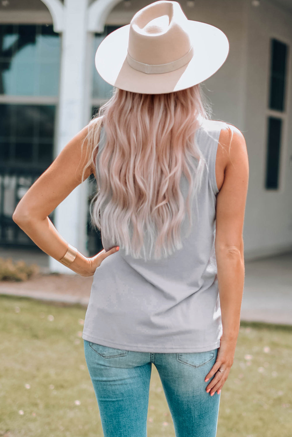 Lightweight lip graphic tank. This one has trendy distressing patches to pair perfectly with your favorite denim.