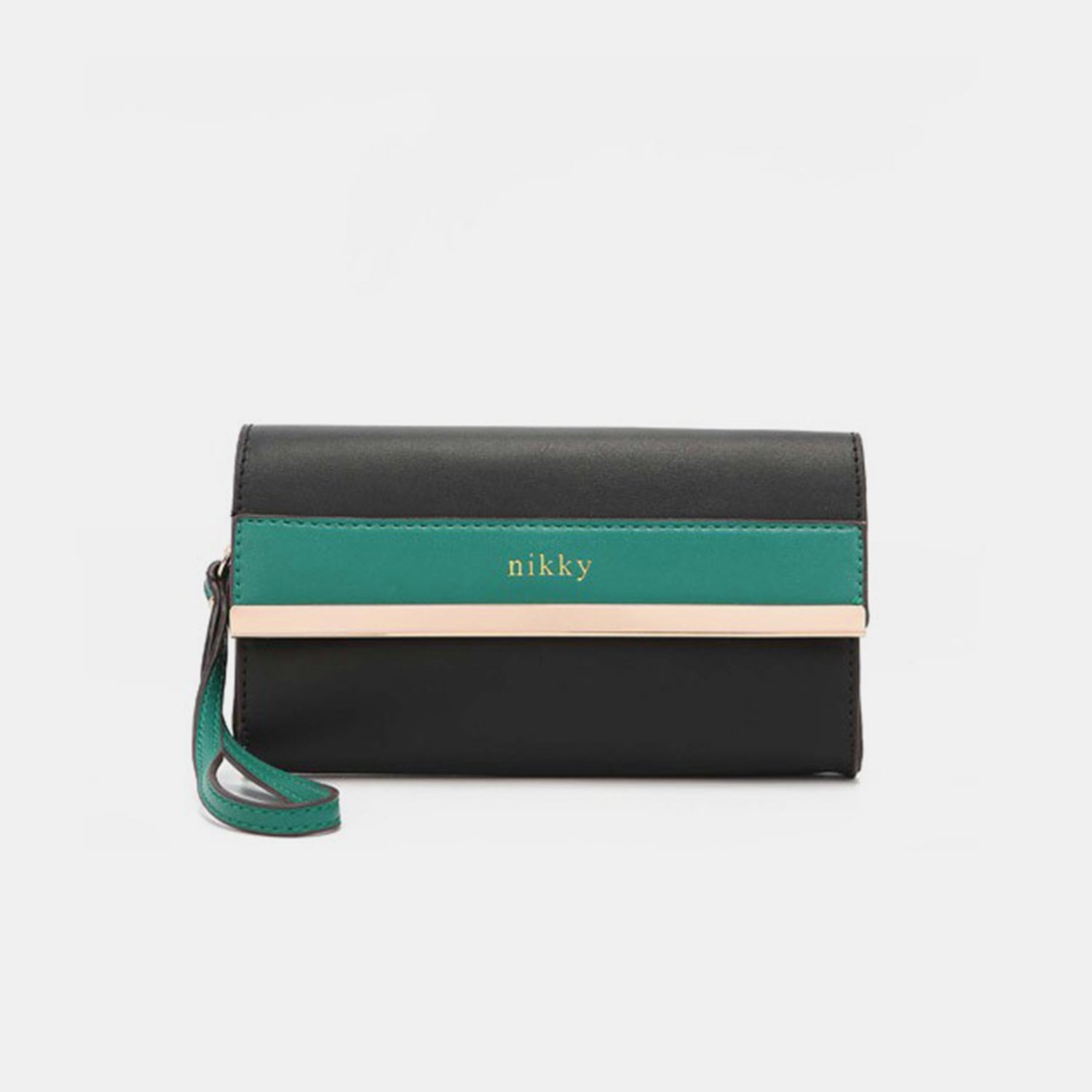 Main zipper closure with buckle magnetic clasp going over the zipper closure on the center. Monogrammed NK logo print on front with geometrical design. Nikky logo nameplate at front. Top 4.5" eco-leather handles. Adjustable and Detachable 45"- 48" shoulder strap.