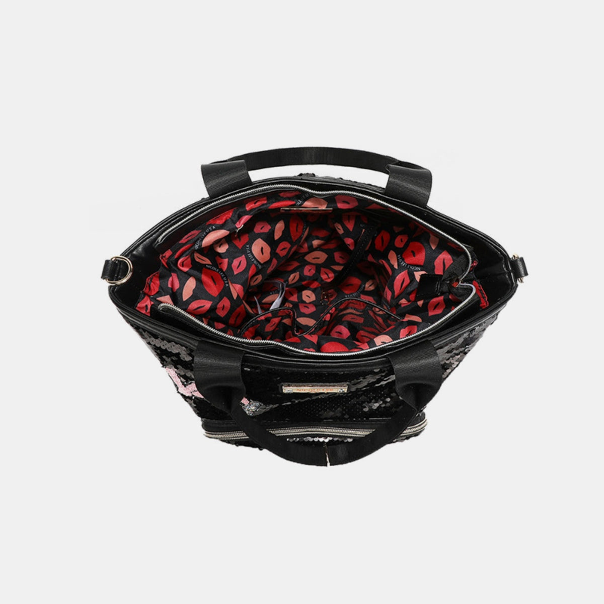 Introducing our new sequin tote featuring a playful patch print design! This stylish tote comes with multiple large zip pockets on the front and sides, perfect for conveniently storing your phone, wallets, and more for easy access.