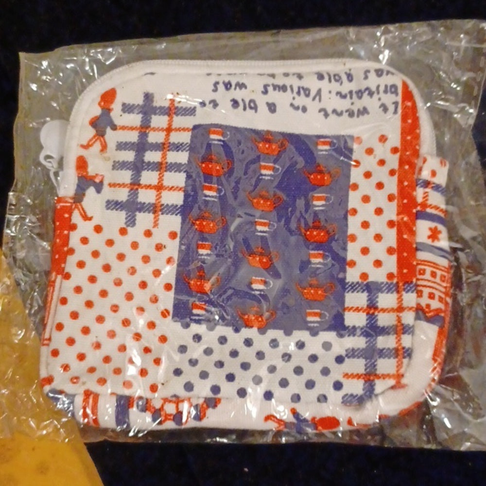 Material has printed words "it went on a ble britain various was was able to be", solders, Tea Cups & Pots. all in red and Blue on White
