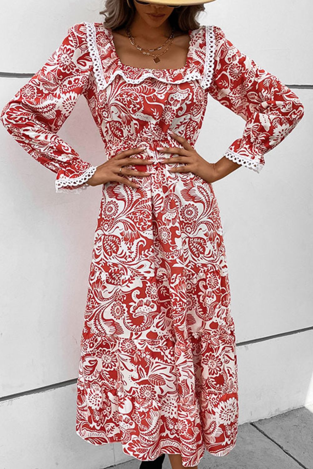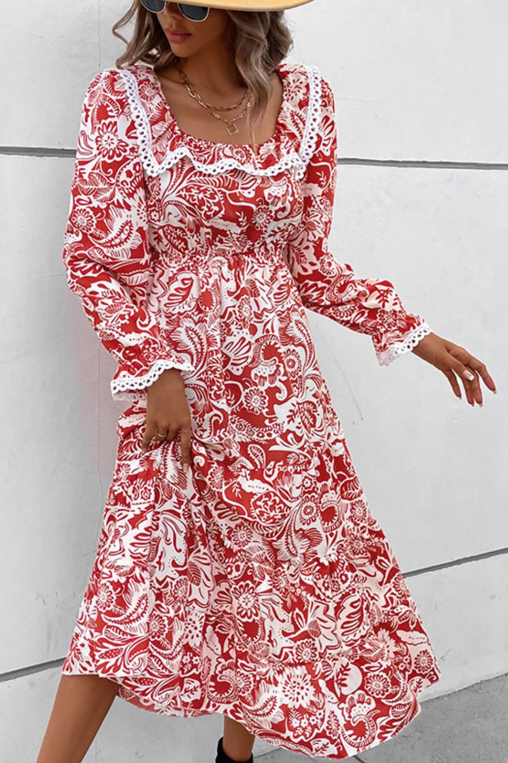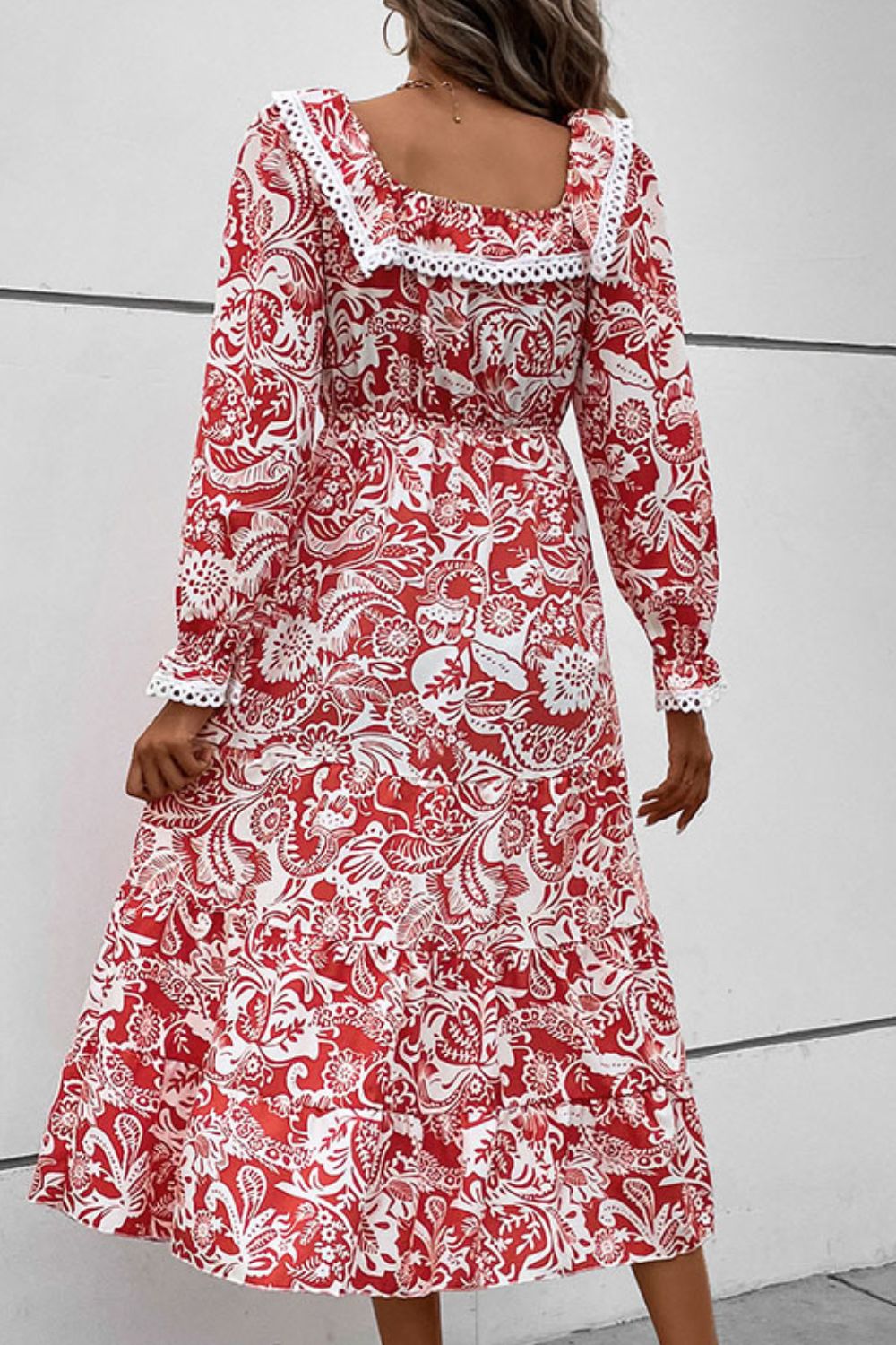 Printed Lace Trim Square Neck Flounce Sleeve Dress