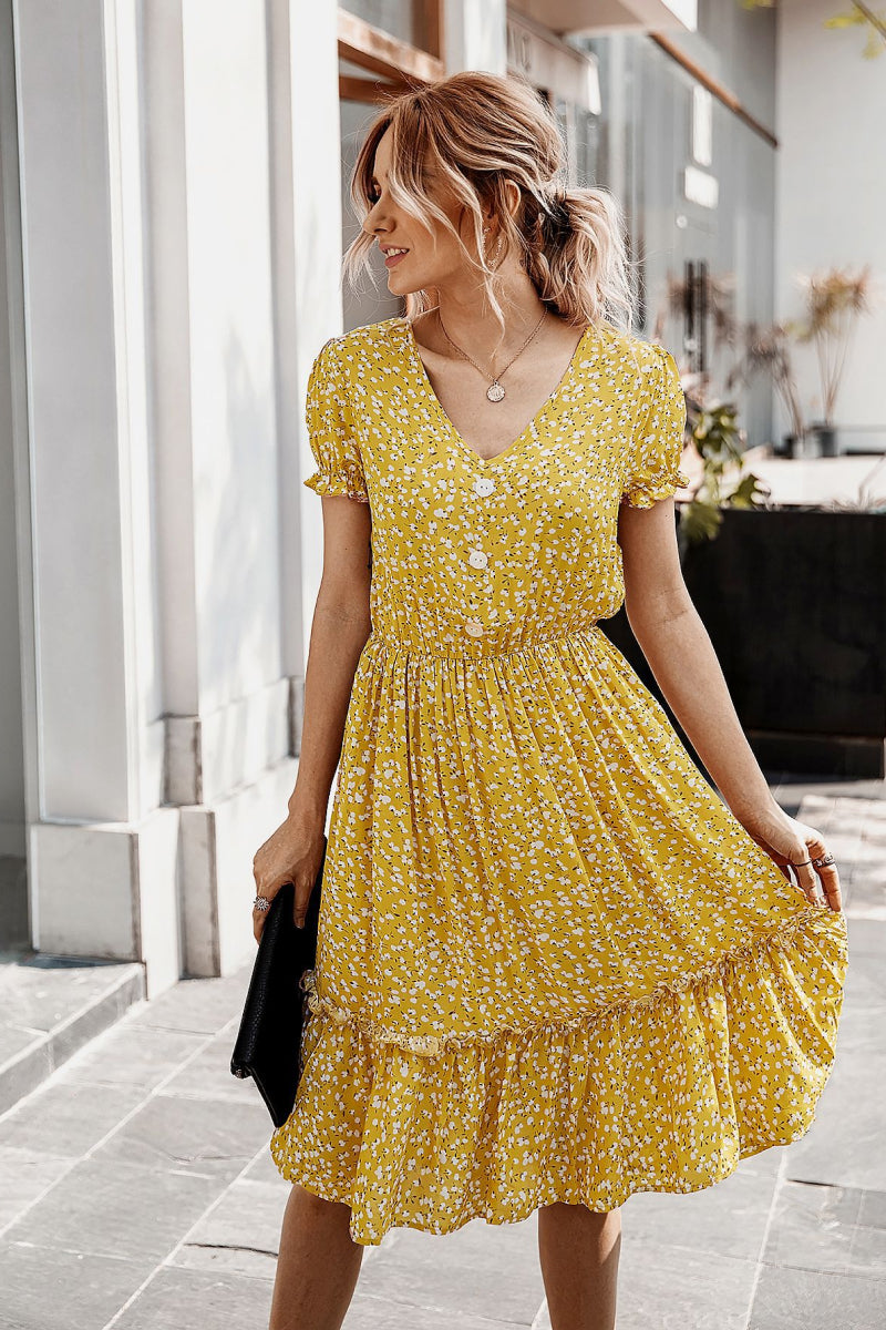 Enjoy effortless, flattering style with this tie-back ruffle dress. The mini dress has a square neck, half sleeves, and ruffle hem.