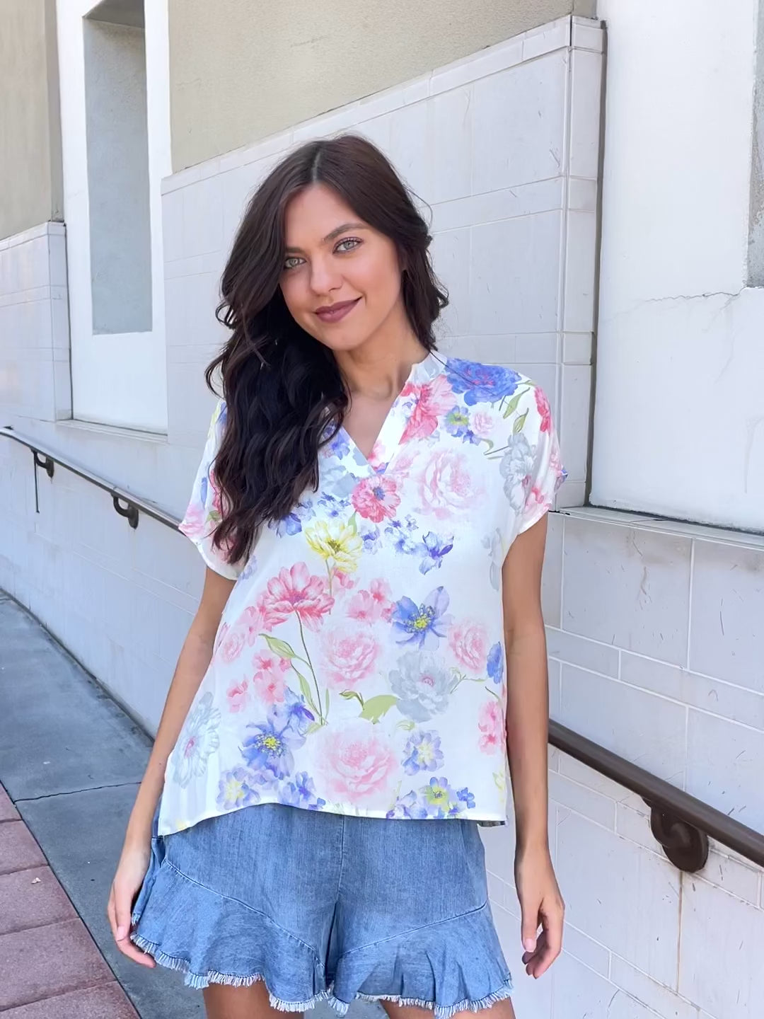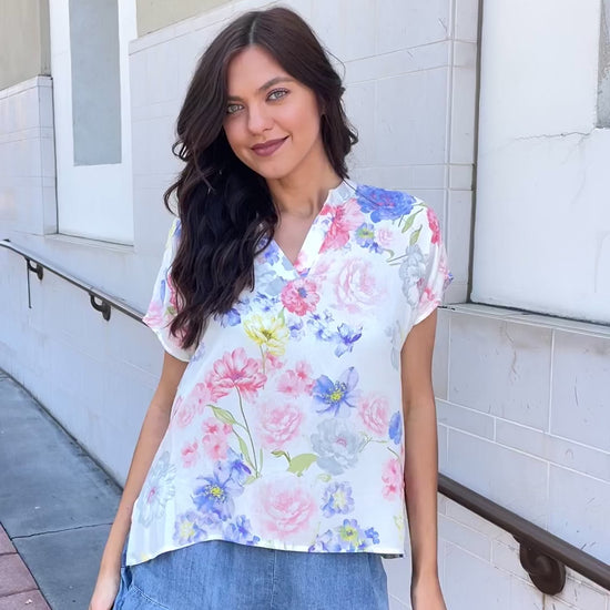 This delightful piece is designed to elevate your wardrobe with its charming floral print and thoughtful details. Crafted from a lightweight dobby woven material, it offers a luxurious feel that ensures both breathability and durability. The top features a flattering notched neckline, adding a touch of elegance to its overall design. This unique neckline accentuates your collarbones and frames your face beautifully. It creates a sophisticated look that effortlessly transitions from day to night, making it suitable for various occasions. With side slits and a hi-lo hem, this top adds a playful and contemporary twist to your outfit. The side slits allow for ease of movement and a relaxed fit, ensuring comfort throughout the day. The hi-lo hem adds a touch of modern flair, providing a stylish asymmetrical silhouette that catches the eye. The floral print is the epitome of femininity, featuring vibrant and delicate blooms that bring life to the garment. The carefully chosen colors and intricate patterns make this top an instant eye-catcher. Whether you're dressing up for a brunch with friends or a casual day out, this floral print woven top is sure to make a statement.